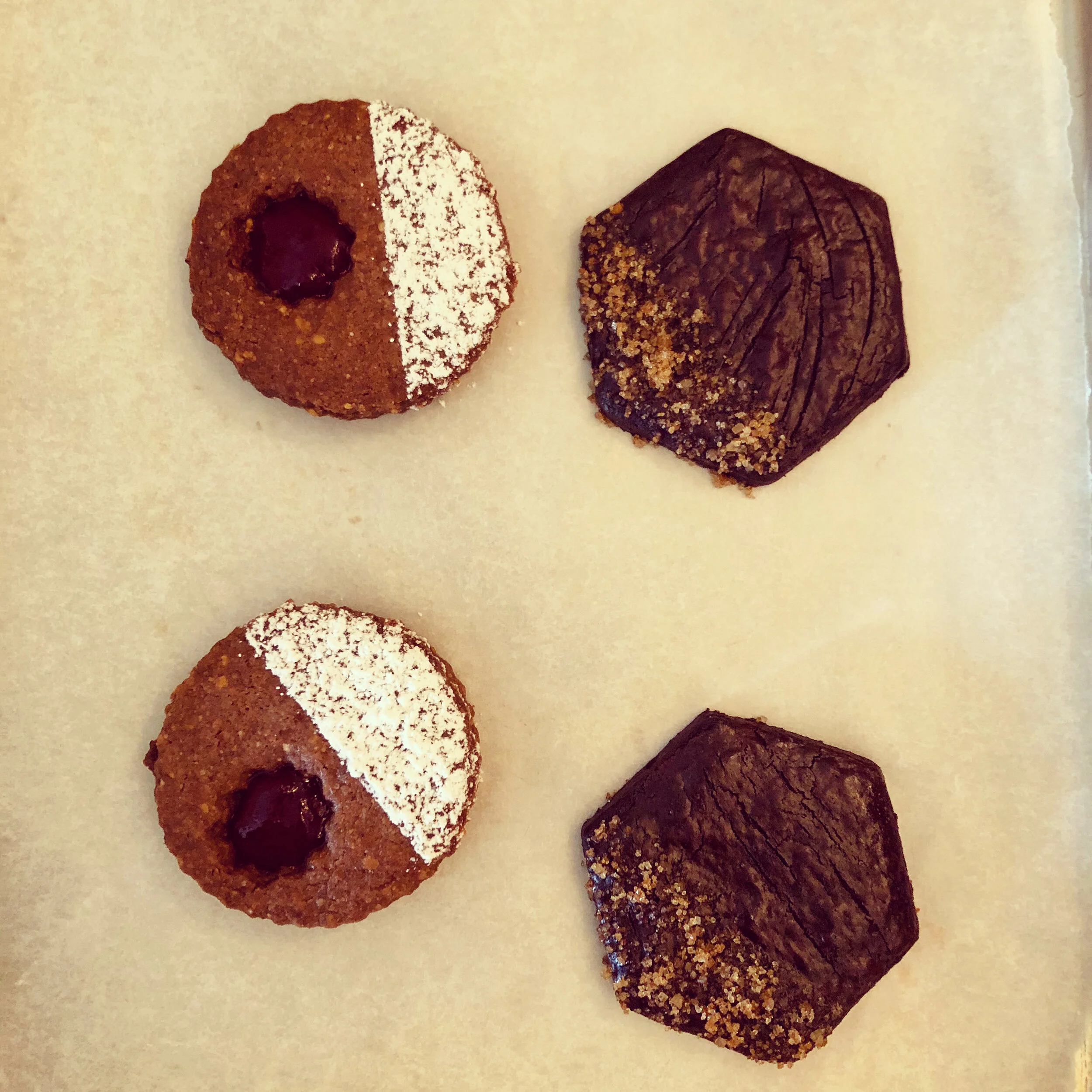 It’s time to embrace the chilly days and get cozy inside with cookies that are filled with warm spices and rich in flavor. I’m opening a few prized jars of Santa Rosa plum jam to fill these toasted almond linzers for a tart counterpoint to the cinnamon and clove. Then you have deeply chocolate wafers with a bit of spiced sugar to enjoy with some milky tea or coffee. This Thursday and Friday order online or at the door at The Kebabery.