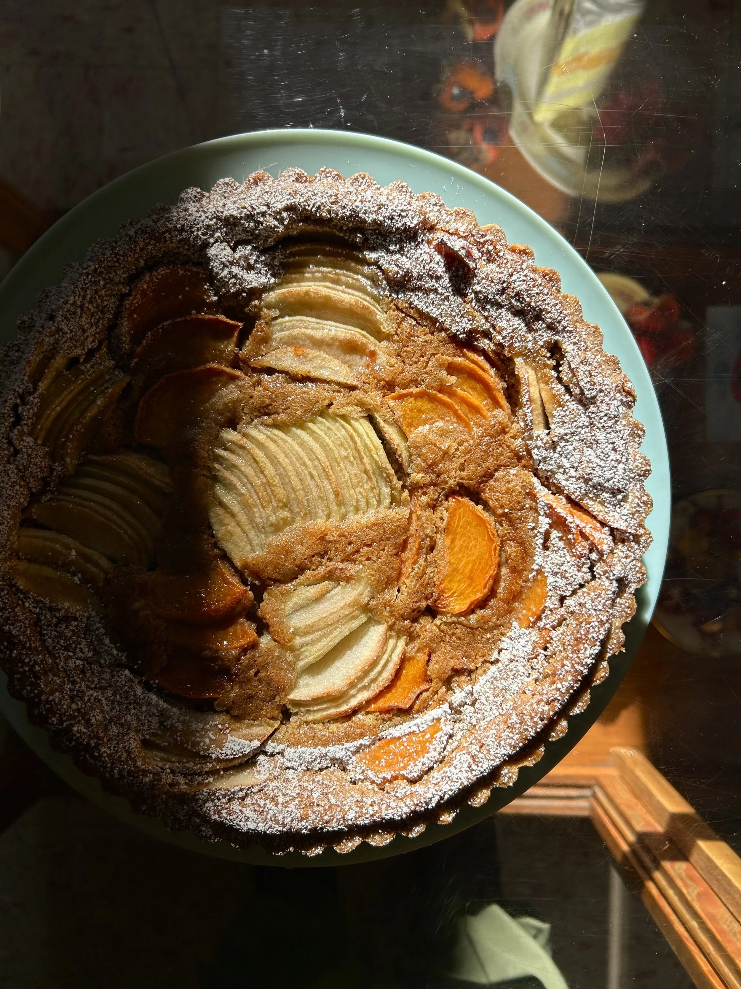 tart slices first come first serve, as available: apple walnut frangipane or kabocha caramel graham