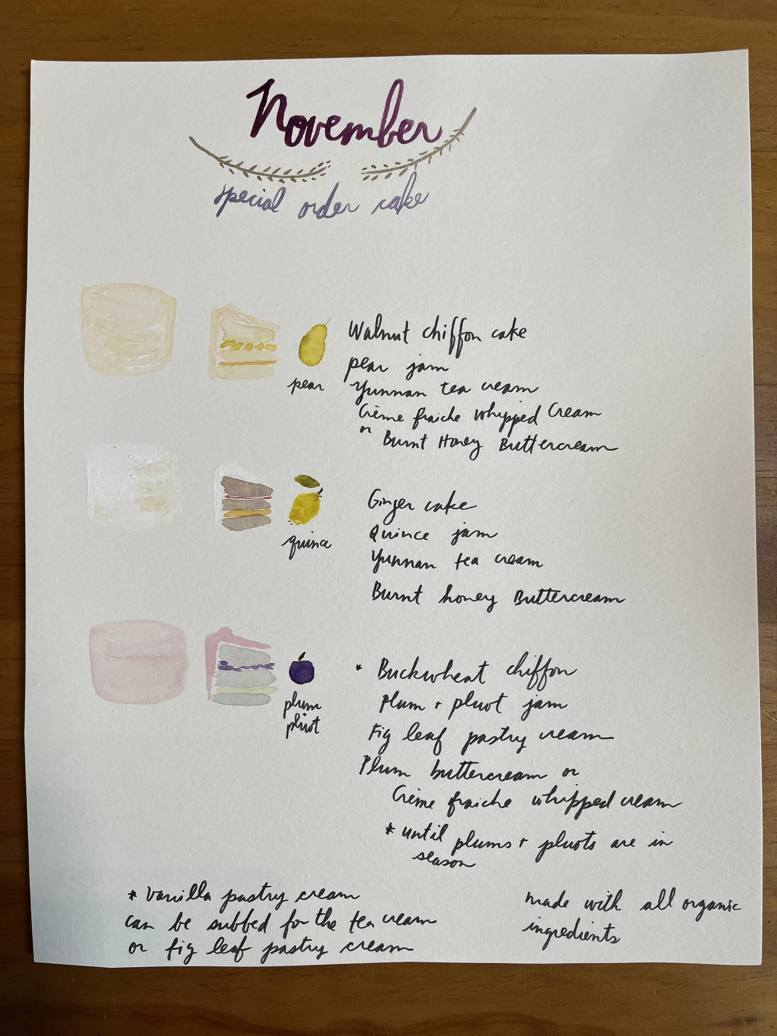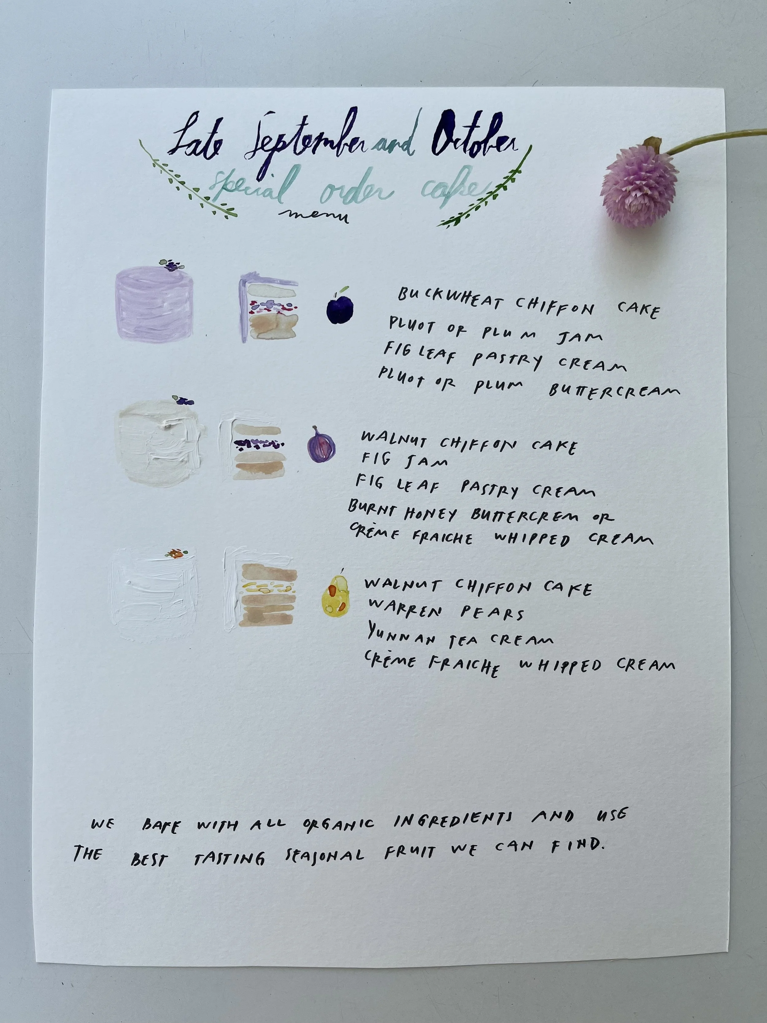 We require at least 7 days notice for special order cakes. We need at least 2 weeks for larger cake orders, and in general more notice is always helpful. Our menus are seasonal, showcase the best tasting organic fruit, and change monthly. You can email us with your special order cake request at sesametinybakery@gmail.com